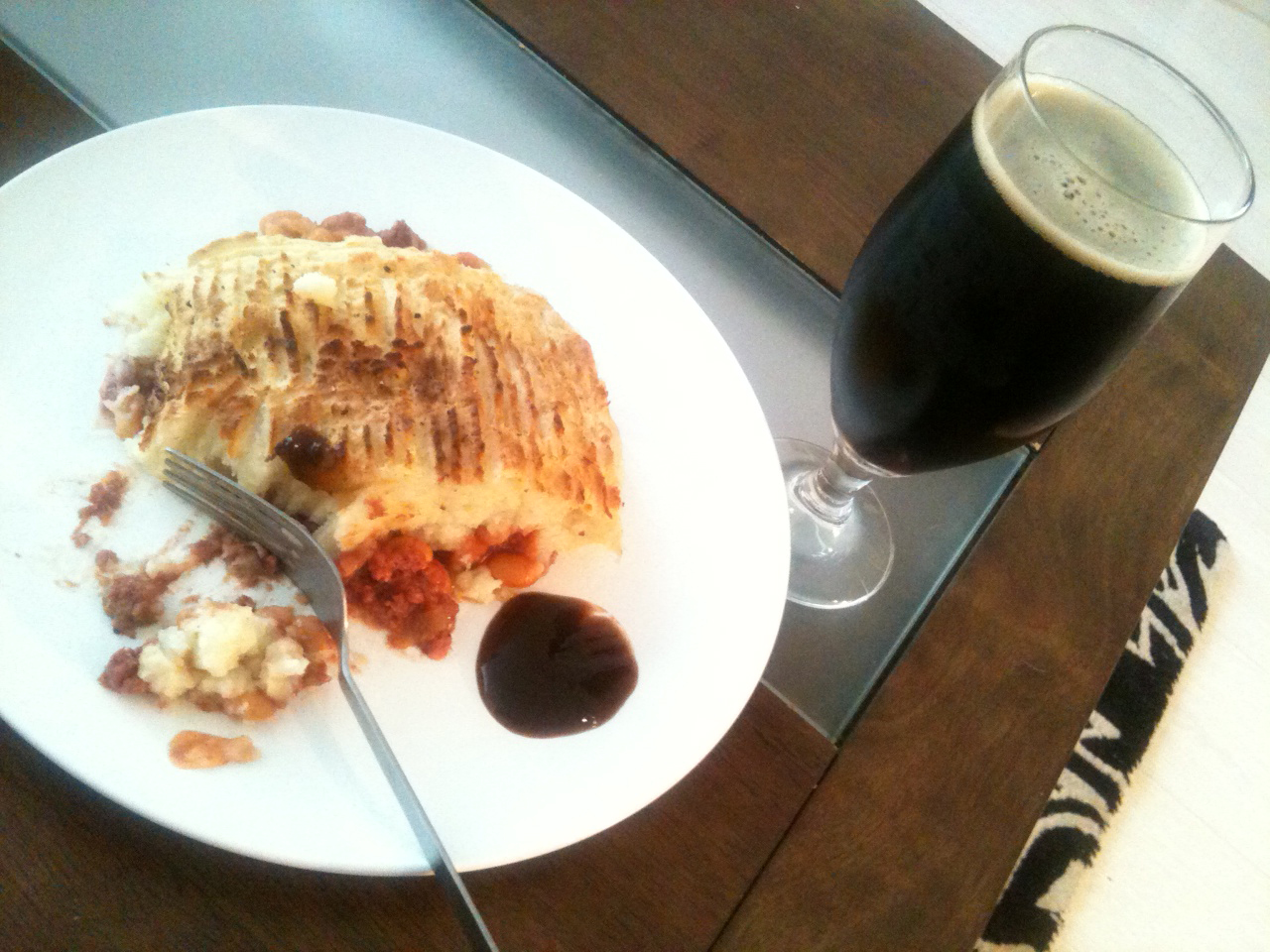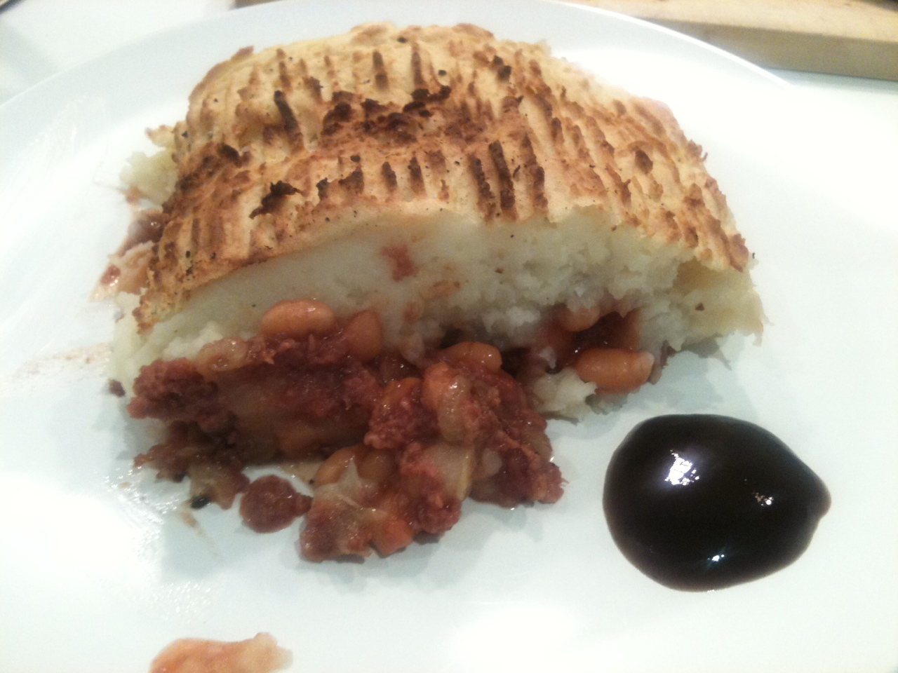 Place in a red hot oven then immediately turn it down to around 220*C, which is still pretty hot, for around 15-20 minutes. You’ll know it’s ready when the top is crispy and lightly brown, and the base mixture is bubbling up in places. Leave to cool for a few minutes before dishing up and serve with a big dollop of good, spicy brown sauce. Perfect!